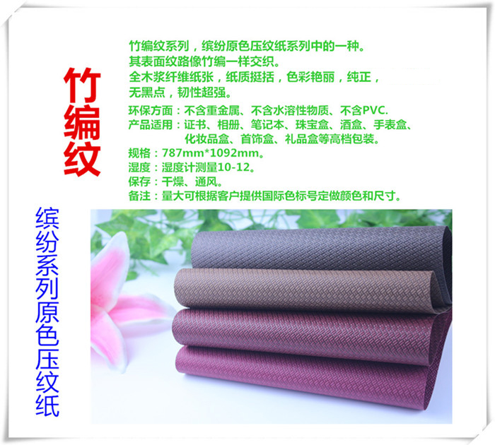 首頁 > 紙典產(chǎn)品 > - 繽紛原漿壓紋紙 - 竹編紋竹編紋