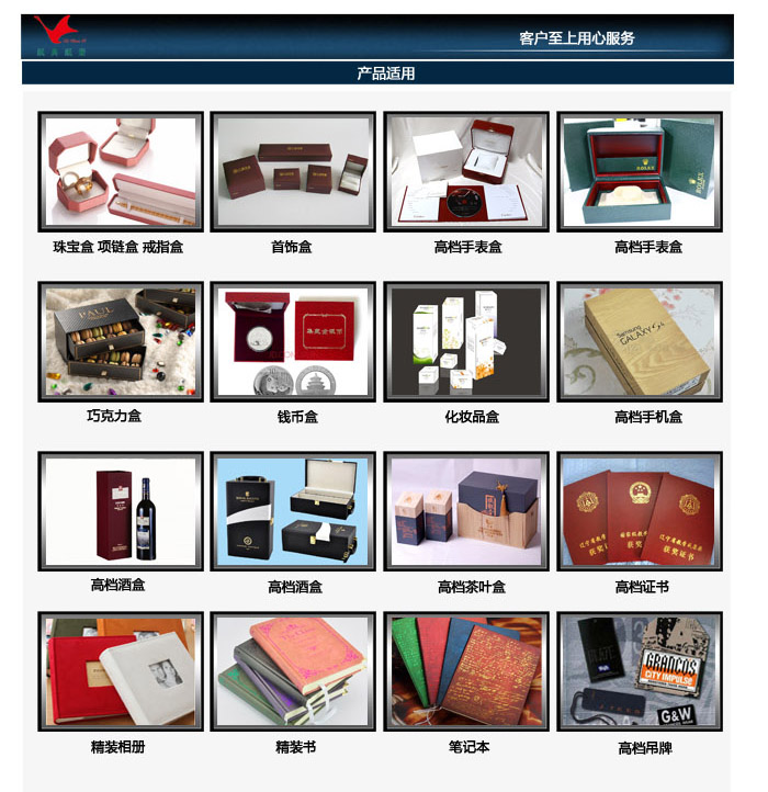 產(chǎn)品適用:相冊(cè)、筆記本、珠寶盒、酒盒、化妝品盒、首飾盒、禮品盒等高檔包裝。